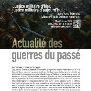 La Chaire est ravie d’annoncer le programme de la deuxième séance de l’Actualité des guerres du passé sur le thème « Justice militaire d’hier, justice militaire d’aujourd’hui ». Nous accueillerons à cette occasion Yves Tremblay (ministère...